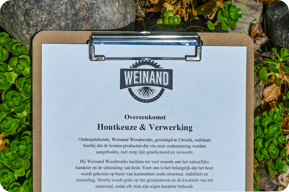 Bij Weinand Woodworks waarderen we de natuurlijke oorsprong en het karakter van hout. Onze producten ontstaan niet zomaar; het hout groeit langzaam en wordt met aandacht geselecteerd. We streven ernaar zorgvuldig te werken, met respect voor de natuurlijke omgeving en het materiaal zelf.